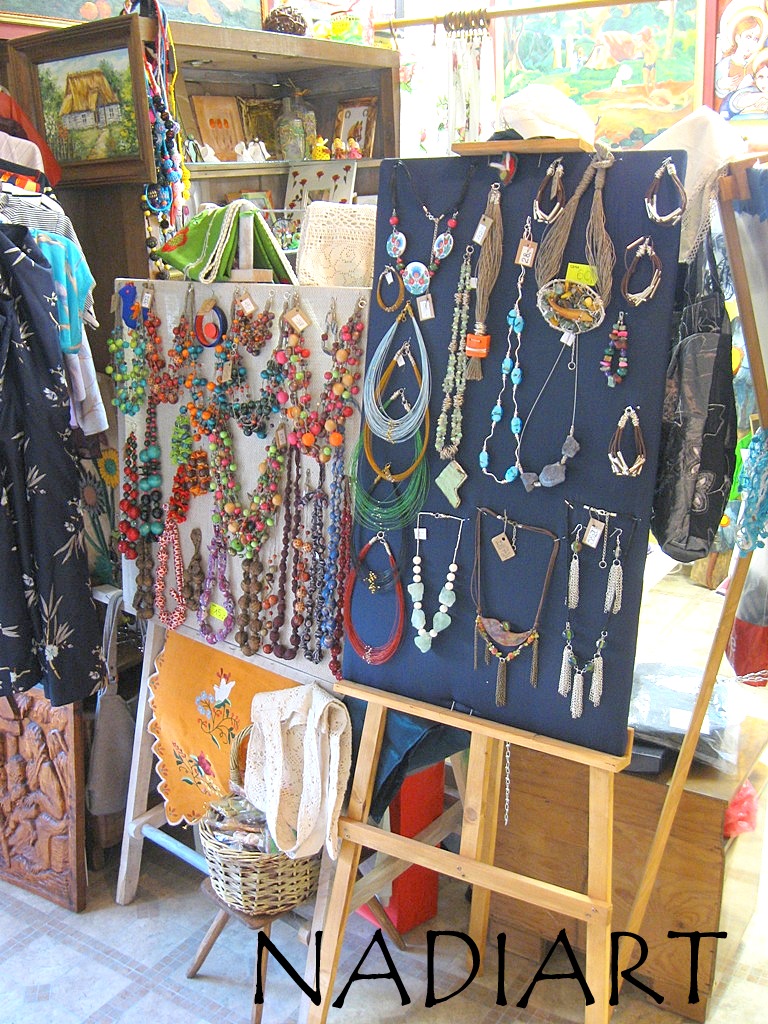 Pierwsze zdjęcie od środka - drzwi wejściowe. Zasłonięte od plagi letniej - owadów rozmaitych. Widać dechę - przygotowana do malowania szyldu - będzie stała na zewnątrz.Wieszak z moim szyciem dostałam od Asi - mojej przyjaciółki, dobrze znanej wam Lejdik. Dziękuje jej za to :-* bo teraz mogę normalnie eksponować ubranka. Dalej sztalugi z okropnie dużą ilością biżuterii. Kto tu wchodzi to od razu dostaje oczopląsu :)))